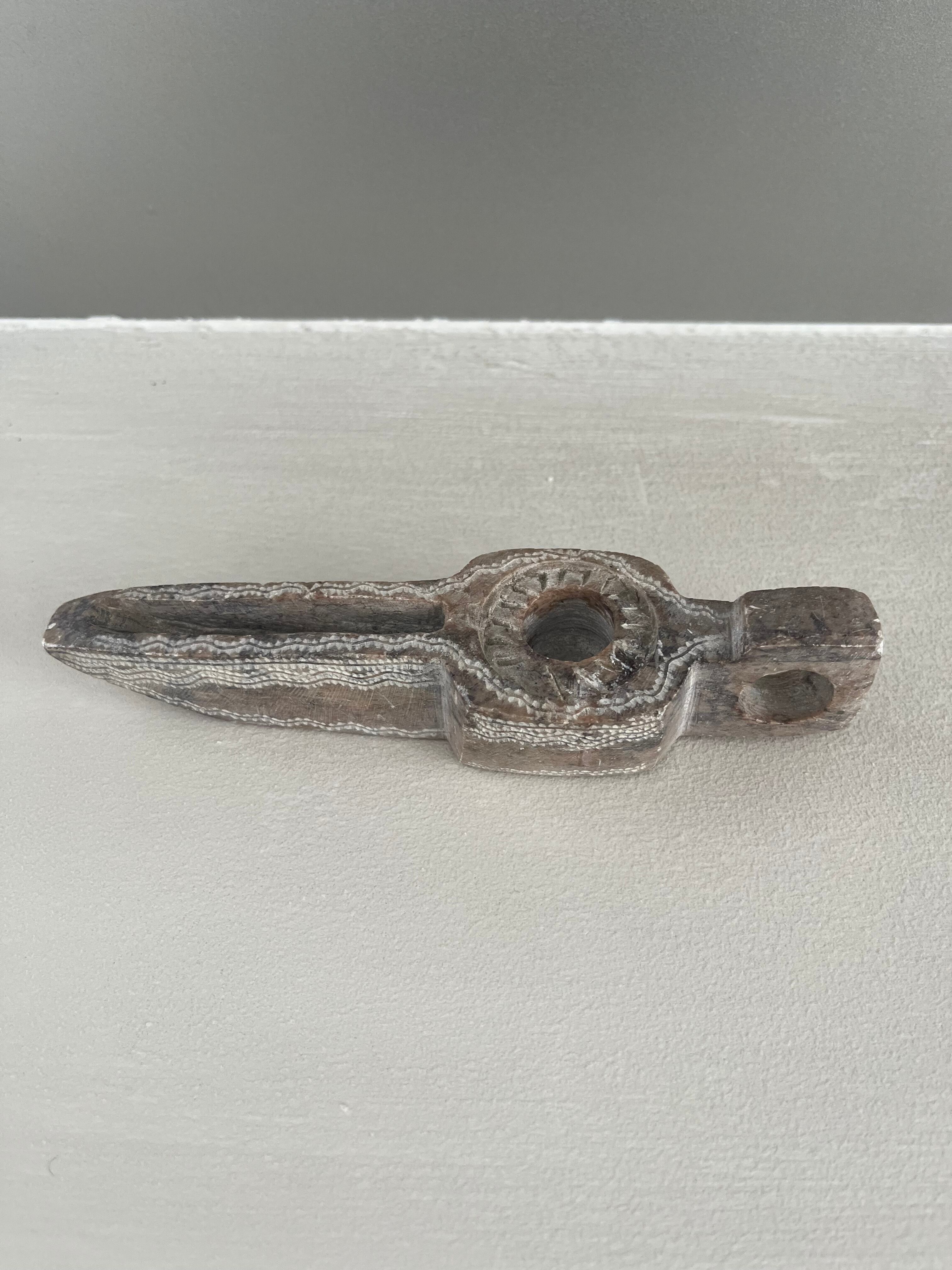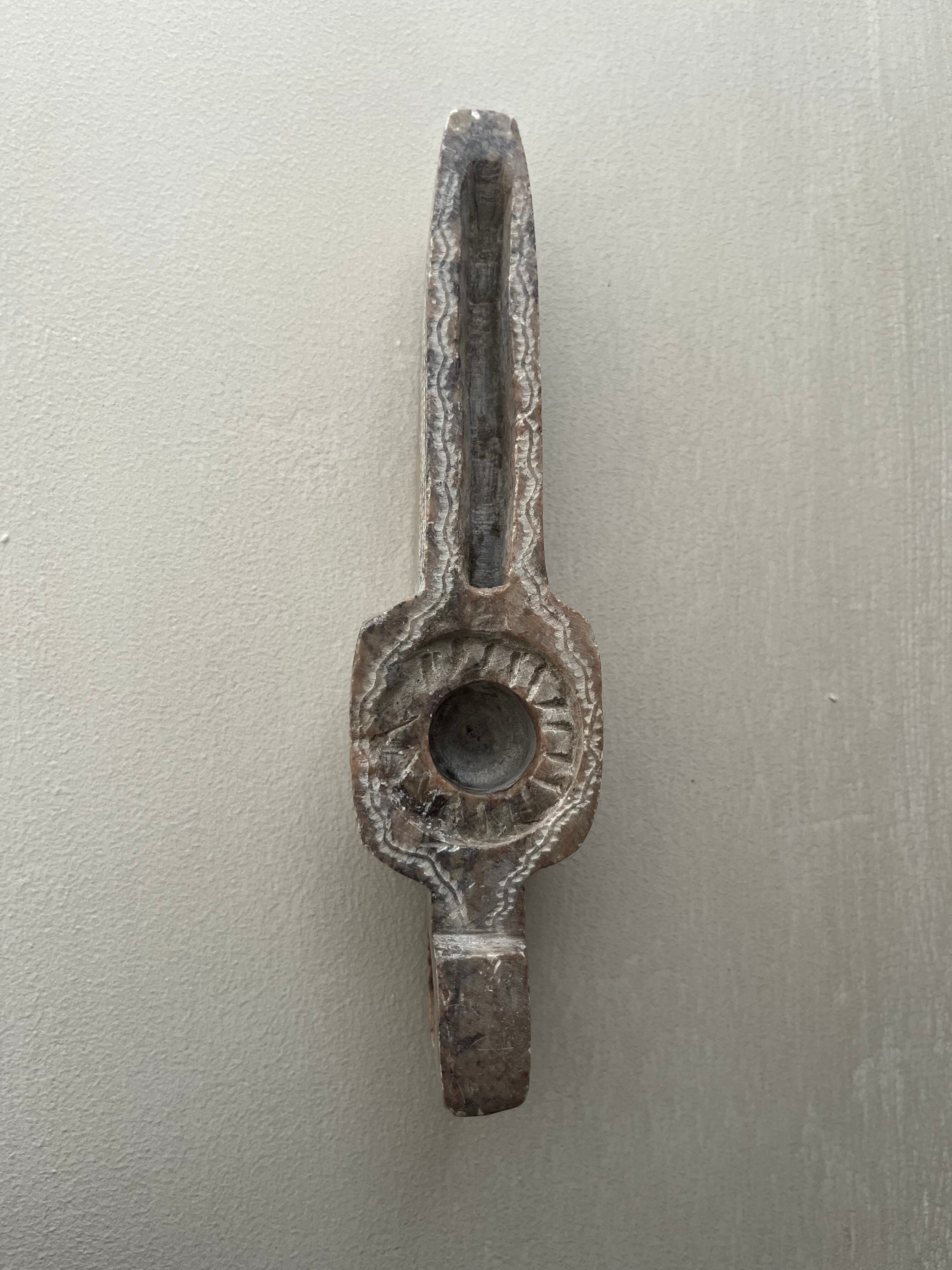 オイルを持ち手側の穴に溜め、ロープを浸して嘴側から垂らし火をつけていたものです。