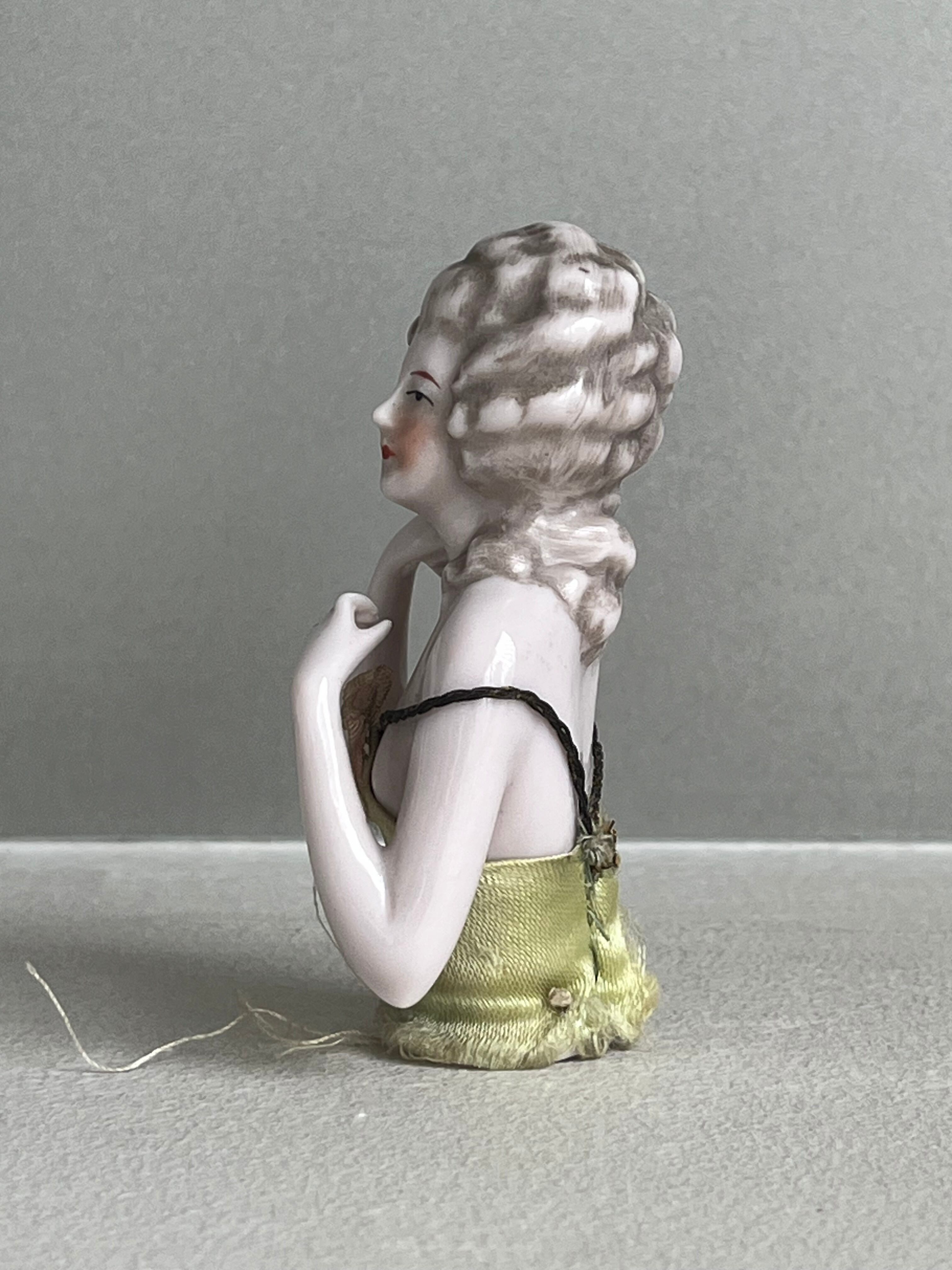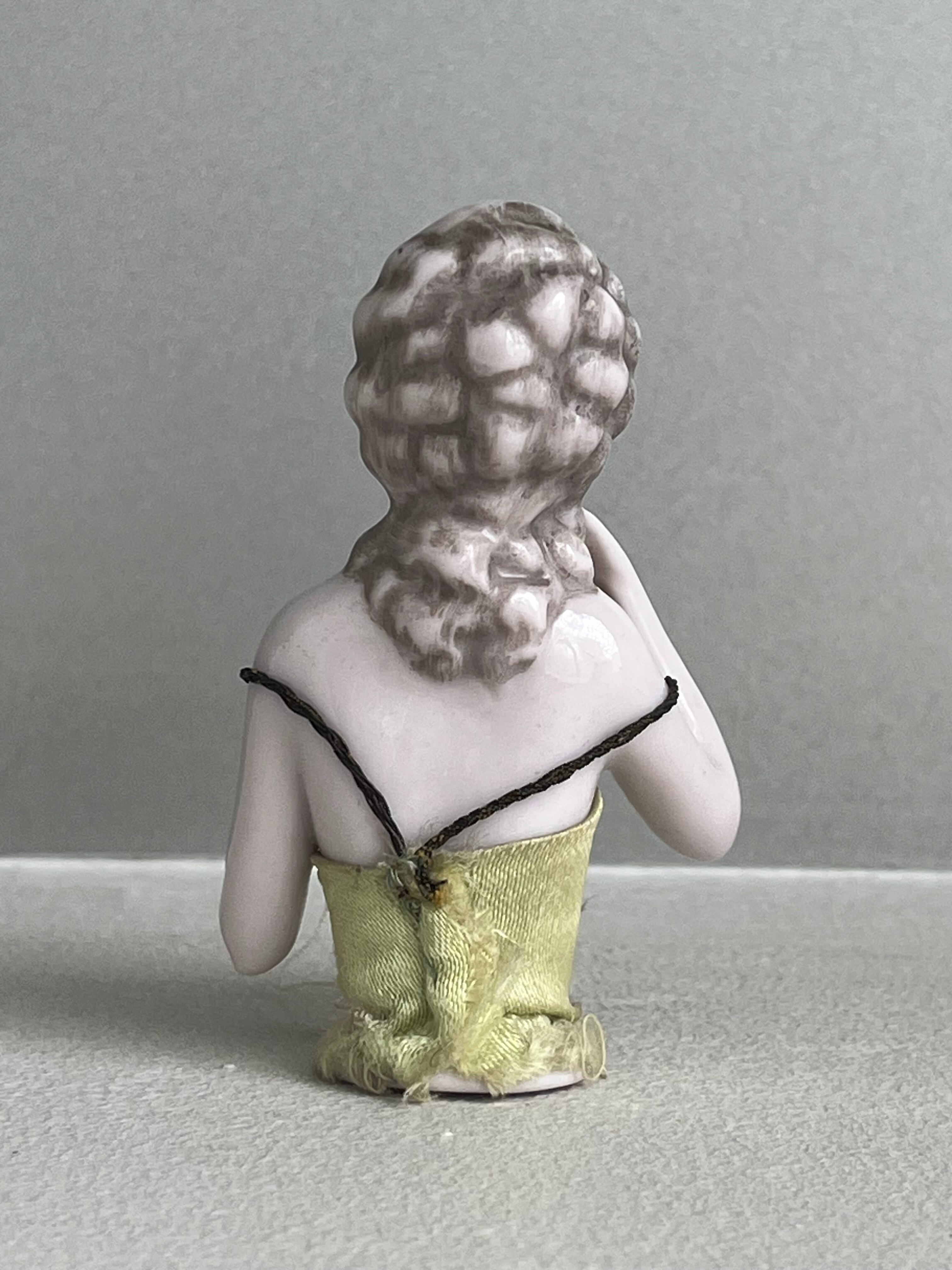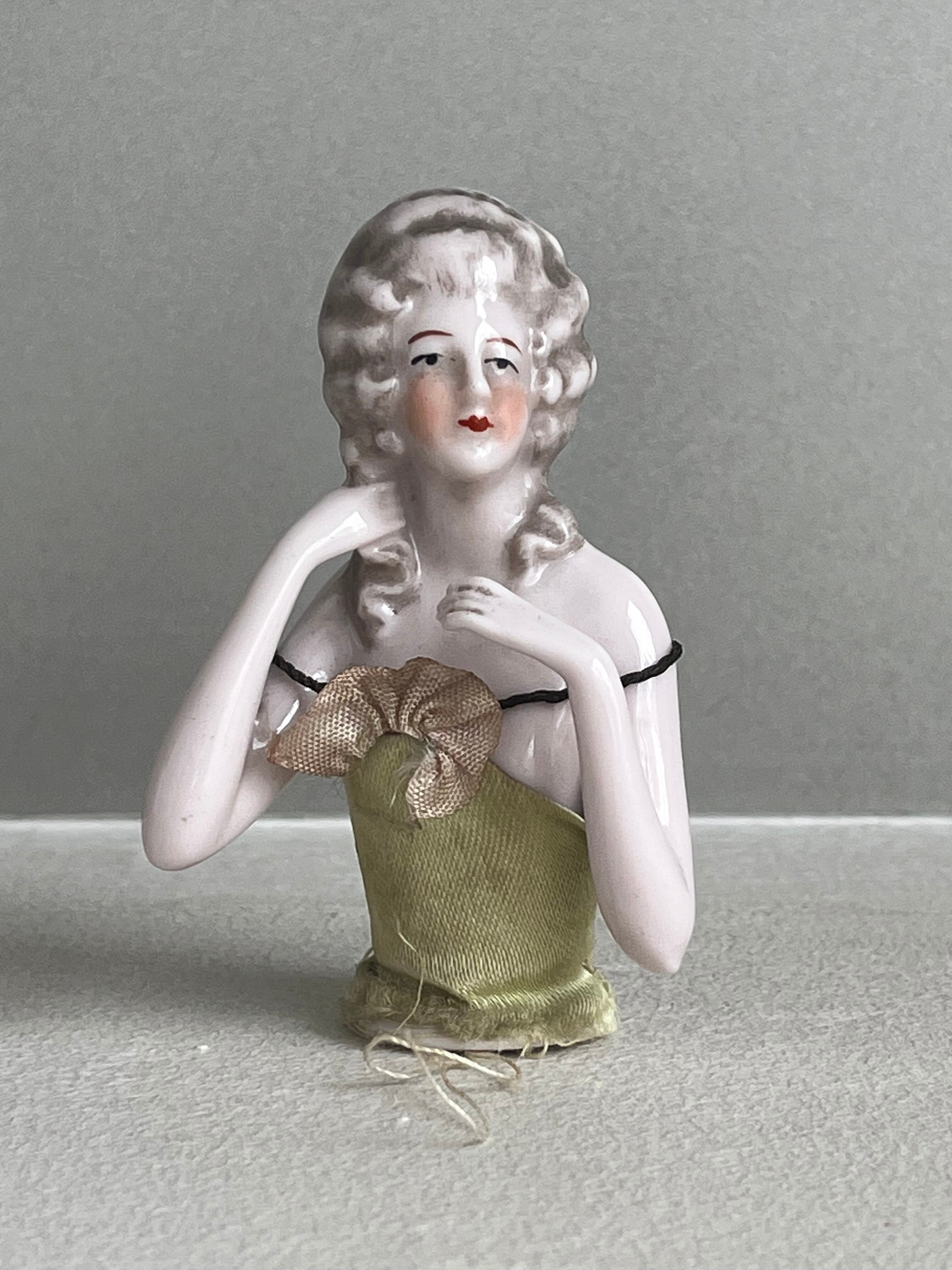 陶器のドールに柔和な顔の絵付けがされており、ドレスは布製です。