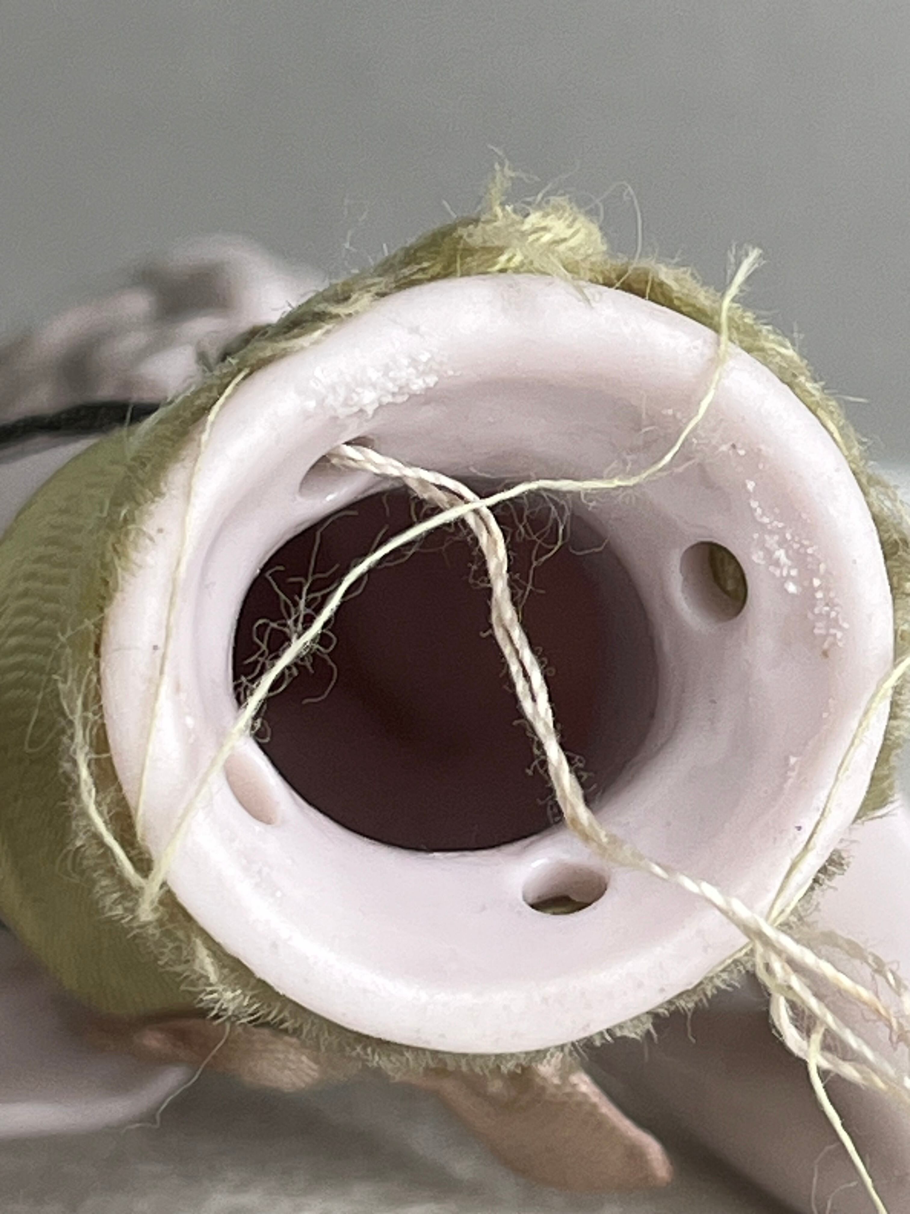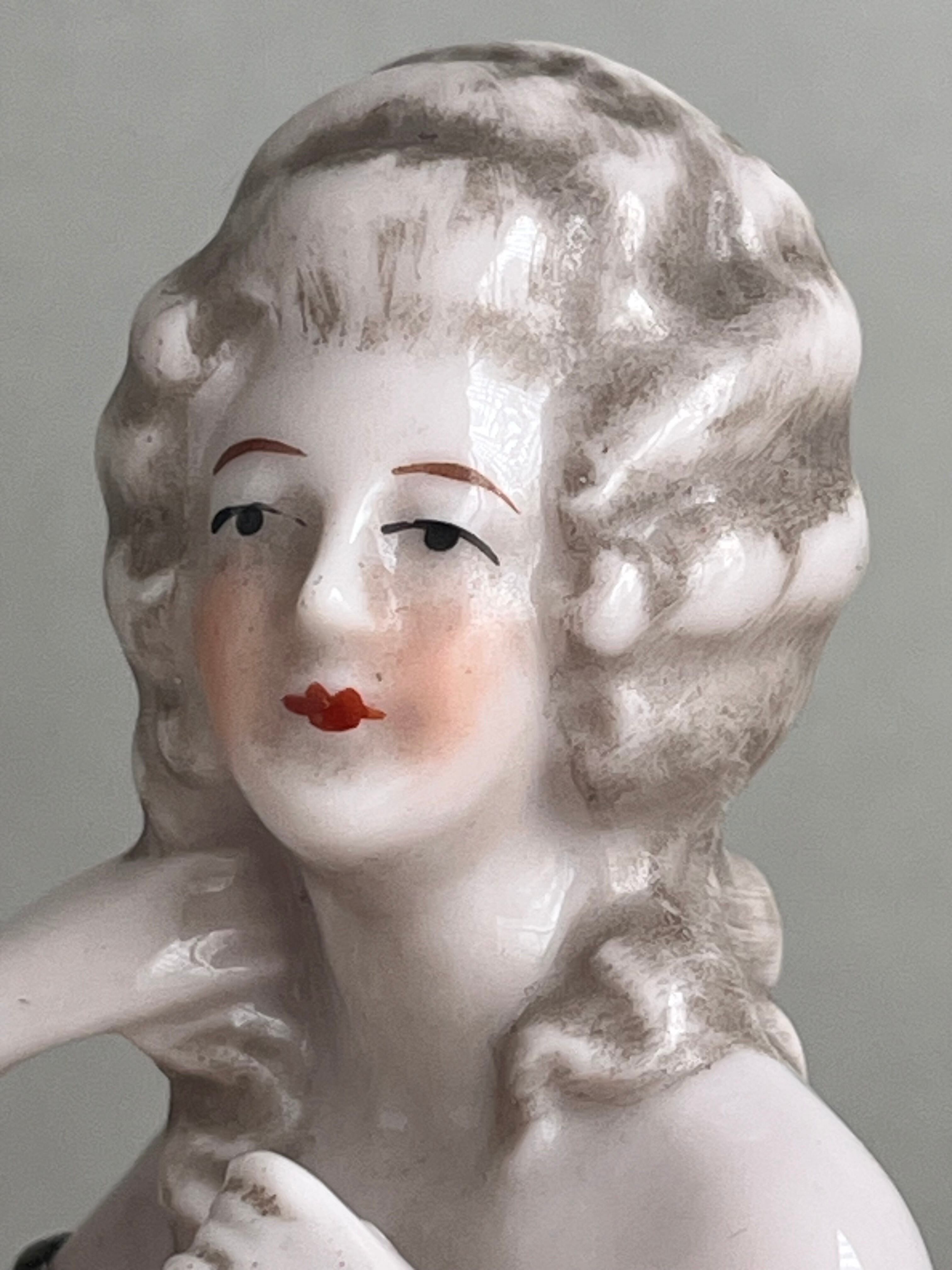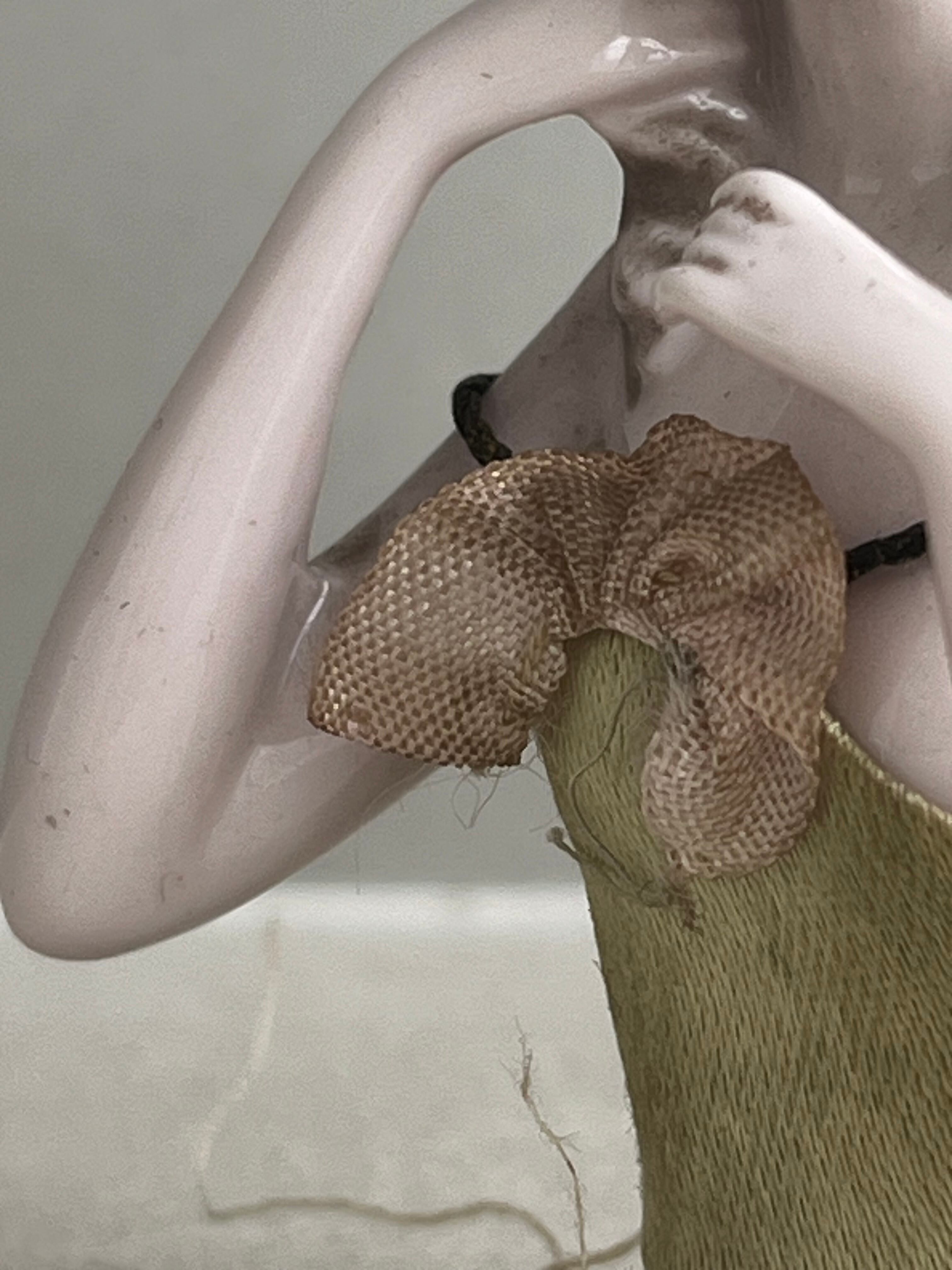 陶器のドールに柔和な顔の絵付けがされており、ドレスは布製です。