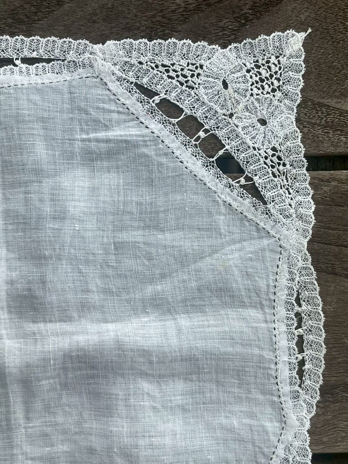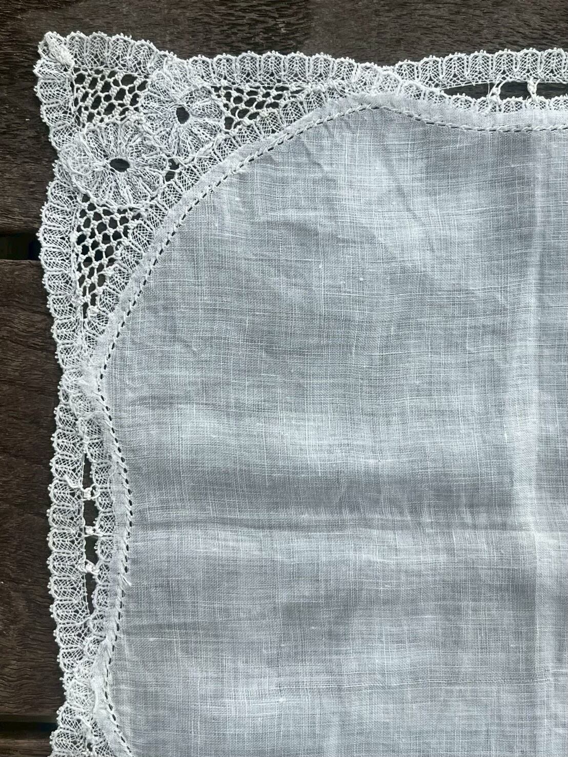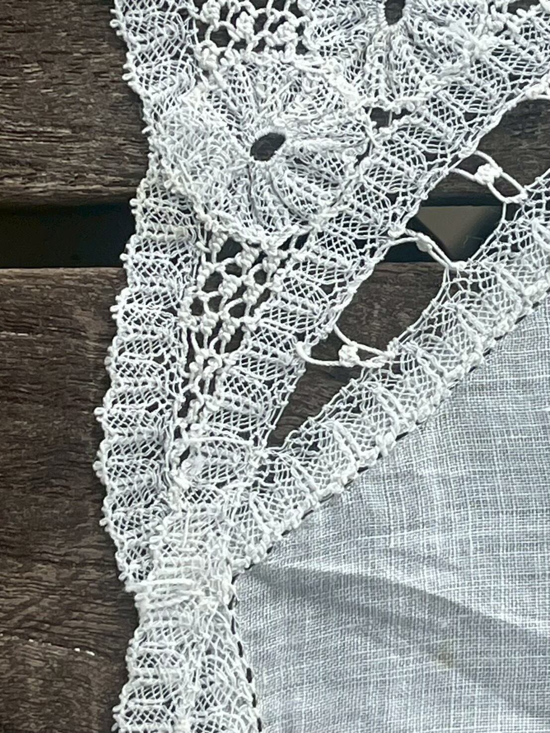 角のデザインには一箇所だけさりげない違いがあり、紐状に編まれたレースが繊細な模様を形作っています。